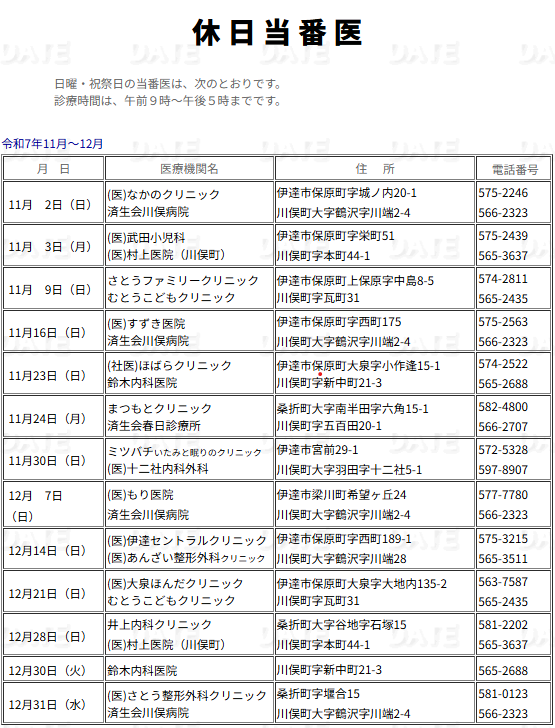 令和7年11月~12月の休日当番医情報です。(伊達医師会ホームページはこちらをクリック)