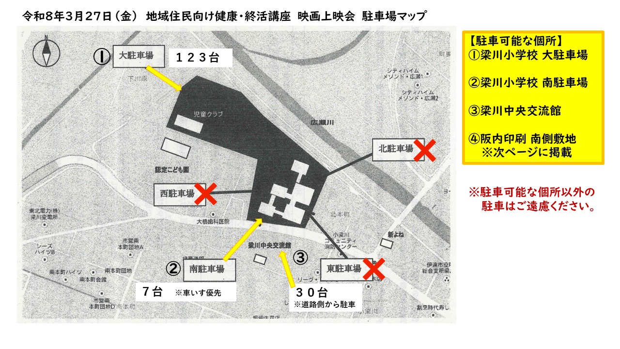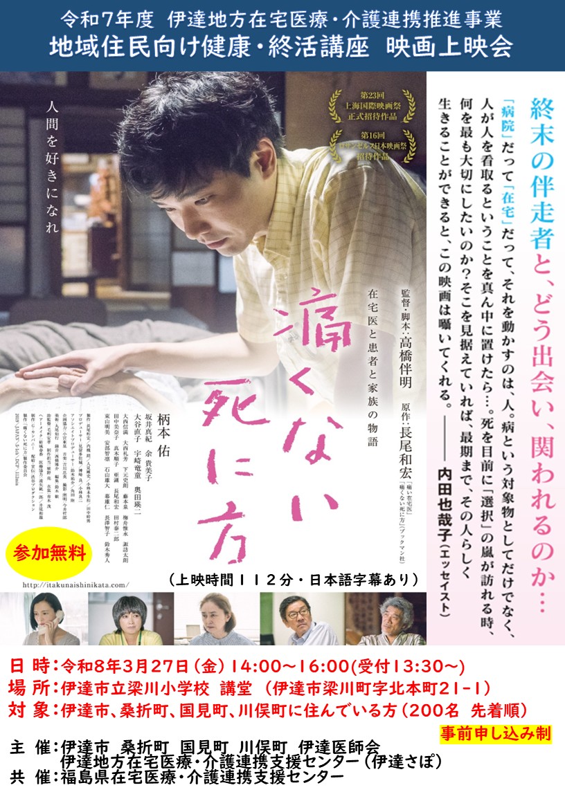 令和7年度 伊達地方在宅医療・介護連携推進事業 映画「痛くない死に方」上映会を開催いたします。 開催日時 令和8年3月27日(金)14:00~16:00 開催場所 伊達市立梁川小学校 講堂 対 象 伊達市、桑折町、国見町、川俣町に住んでいる方が対象です。 定 員 200名 申し込み 令和8年2月24日(火)~3月13日(金)まで 【こちらからも申し込みができます】 【チラシはこちらをクリック】 【駐車場 情報①はこちらをクリック】 【駐車場 情報②はこちらをクリック】![]()