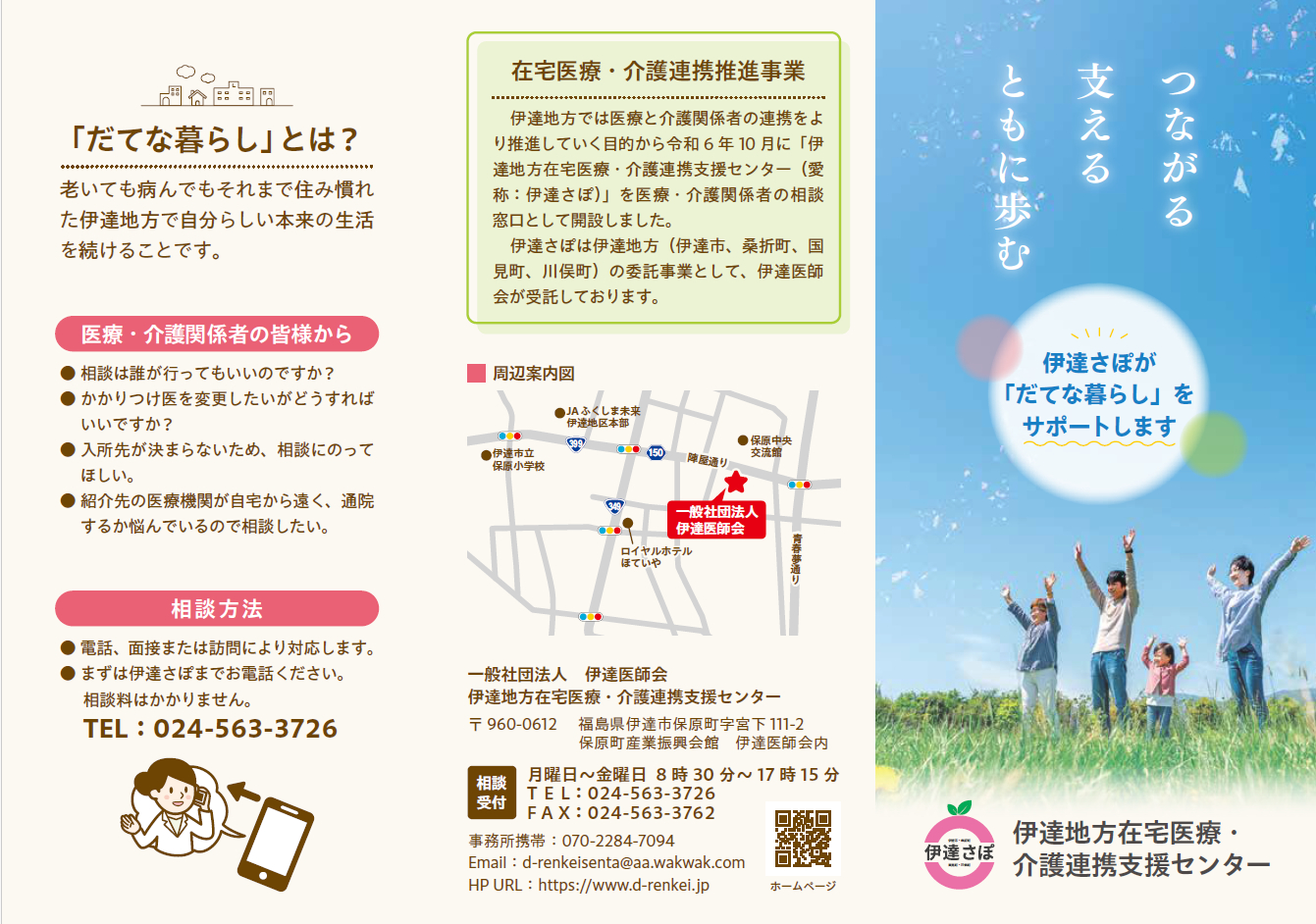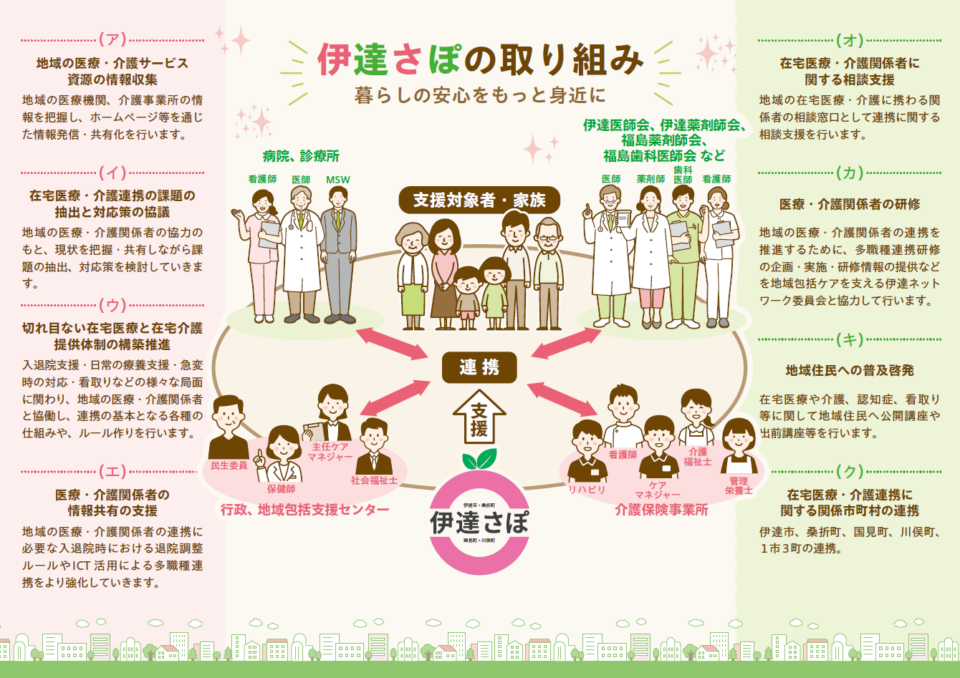 伊達地方在宅医療・介護連携支援センターは、自宅で「医療」と「介護」の両方を必要とする状態の高齢者が、住み慣れた地域で自分らしい暮らしを続けることができるよう、多職種協働による切れ目ない在宅医療と介護のサービスが一体的に提供できる体制の構築と、医療・介護の専門職間の更なる連携の推進を目的とした機関で、行政(伊達市・桑折町・国見町・川俣町)から伊達医師会へ事業が委託され、設置されております。【伊達さぽの取り組みに関する情報はこちらから→(リーフレット)】